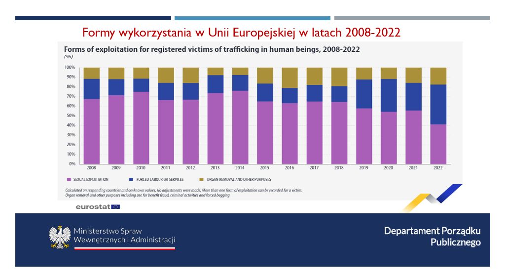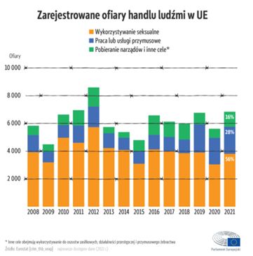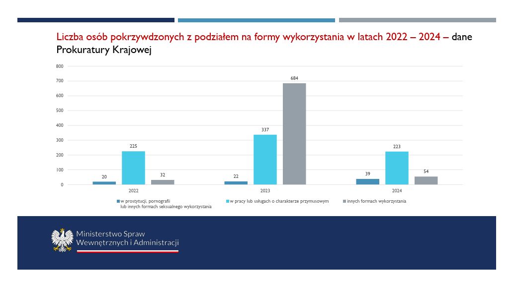 - Wykorzystanie seksualne – zmuszanie do prostytucji, pornografii, cyberseksu. Zgoda ofiary na początku nie wyklucza uznania jej za ofiarę przestępstwa.
