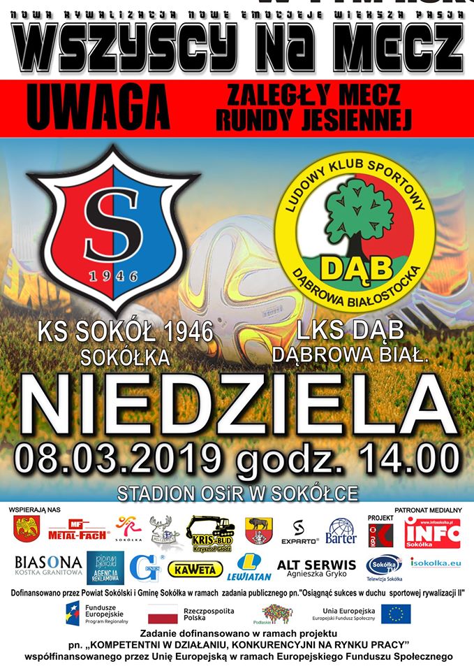 W niedzielę 8 marca na stadionie OSiR w Sokółce o godz. 14:00 odbędzie się mecz piłki nożnej. Piłkarze KS SOKÓŁ 1946 zmierzą się z LKS DĄB Dąbrowa Białostocka.