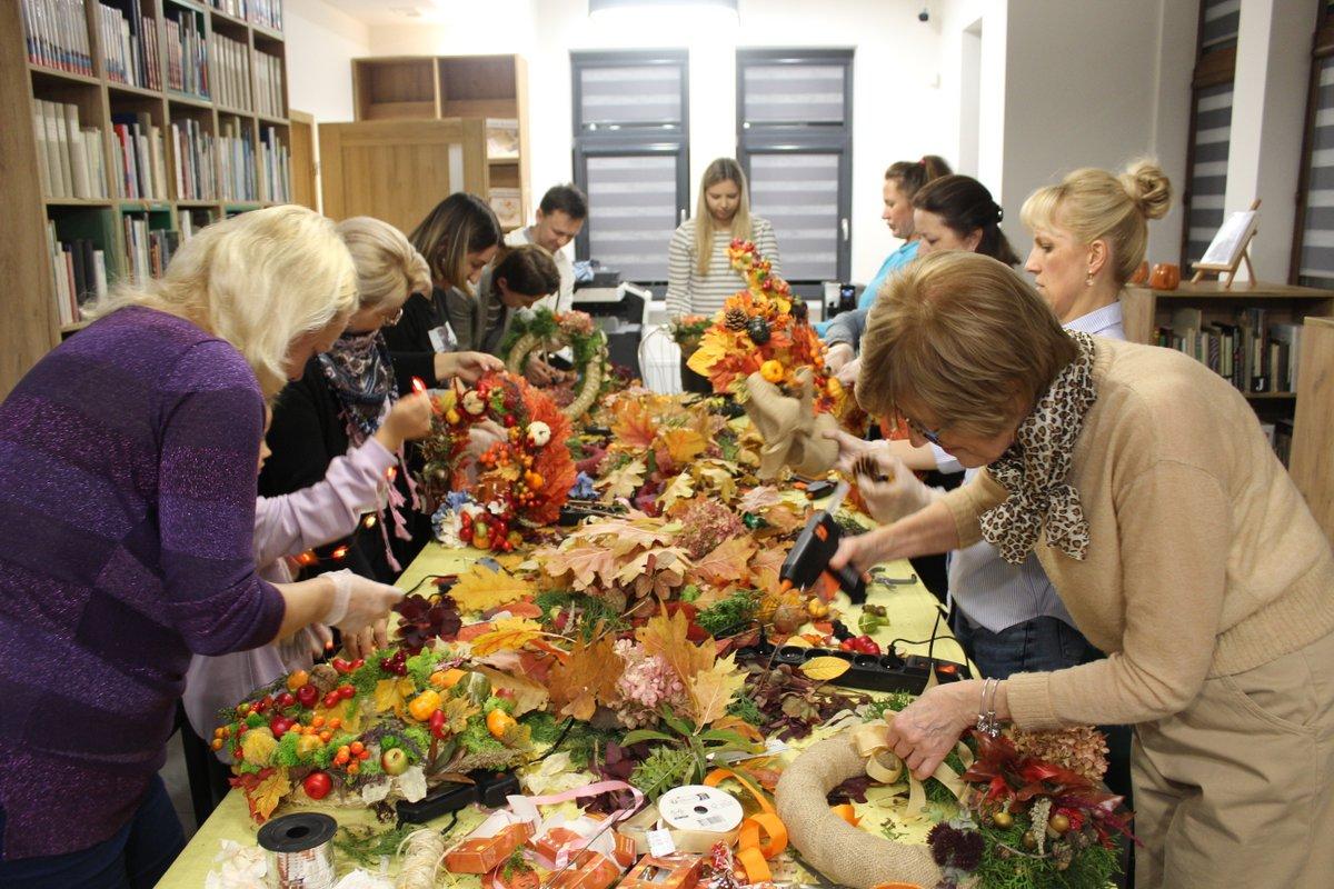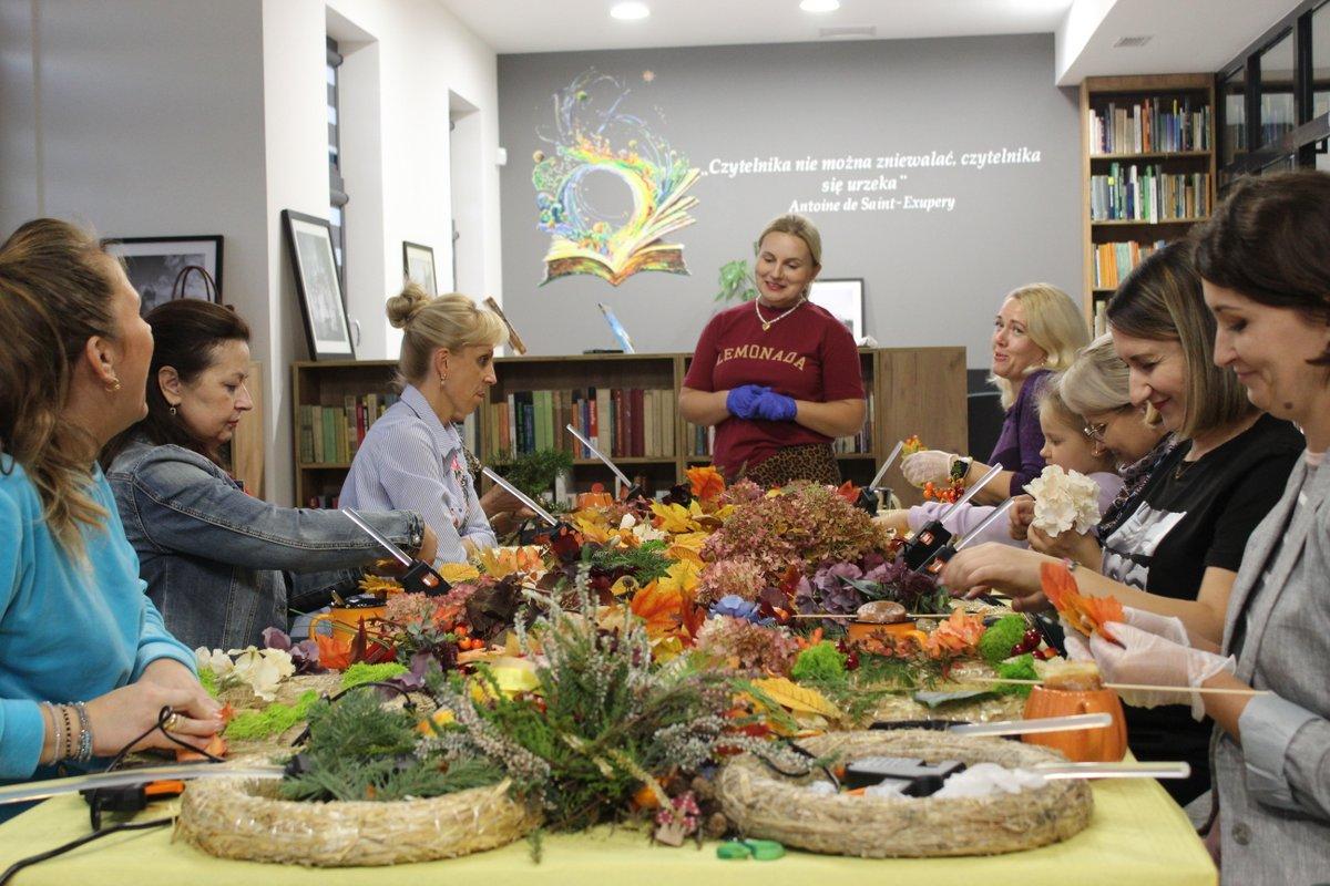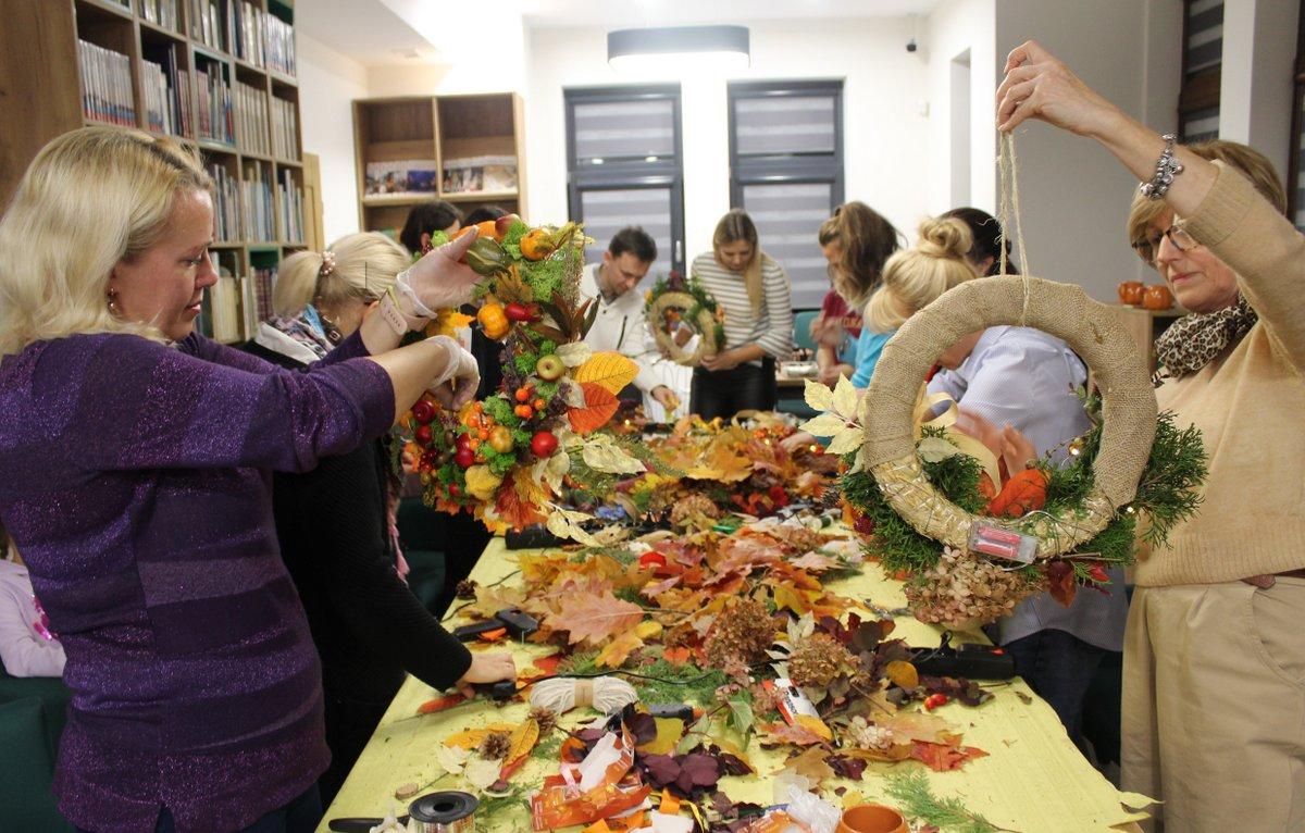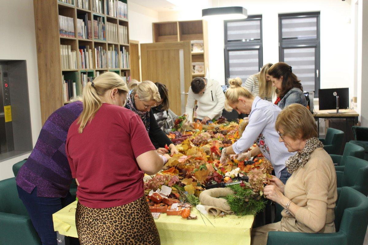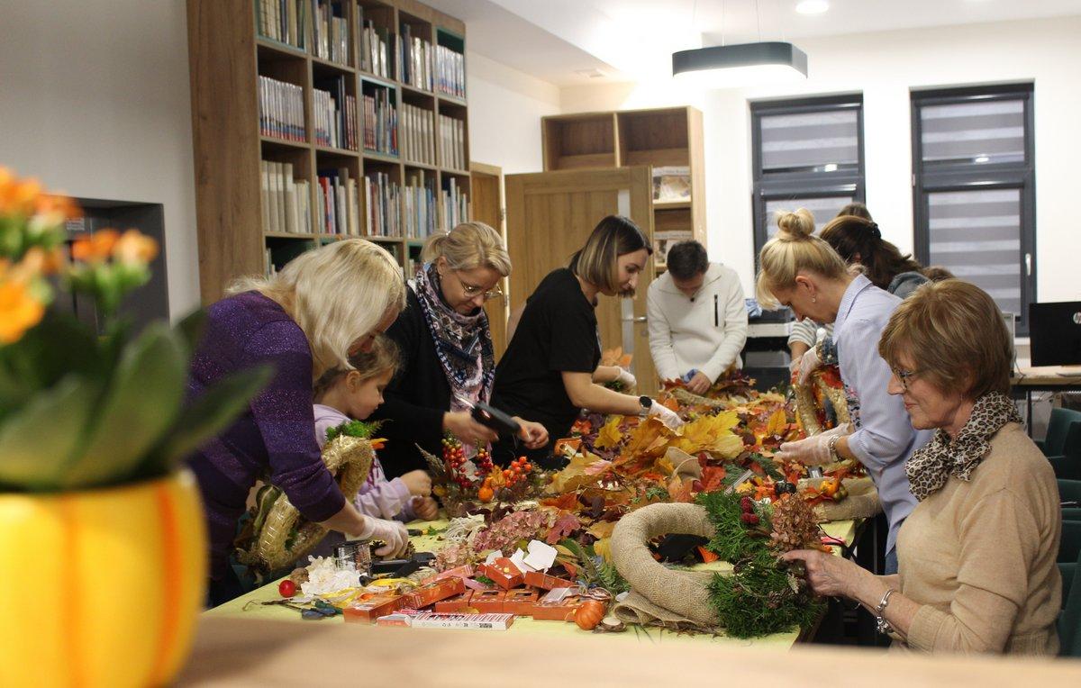 Spotkanie rozpoczęło się od pogadanki przy jesiennej herbacie i omówienia podstaw kompozycji strukturalnej wianków. Uczestniczki, korzystając z rozmaitych ozdób rozłożonych na stole w czytelni, próbowały swoich sił w tajnikach nowej dziedziny.