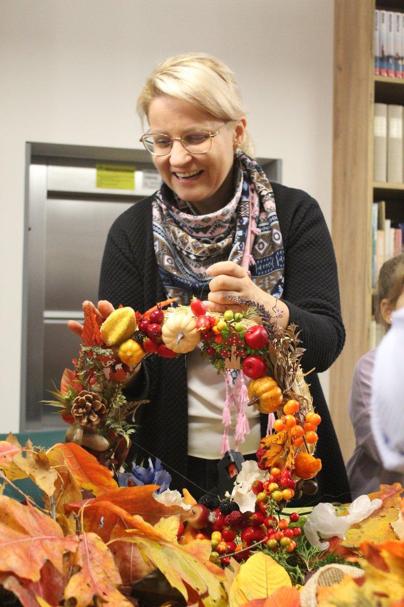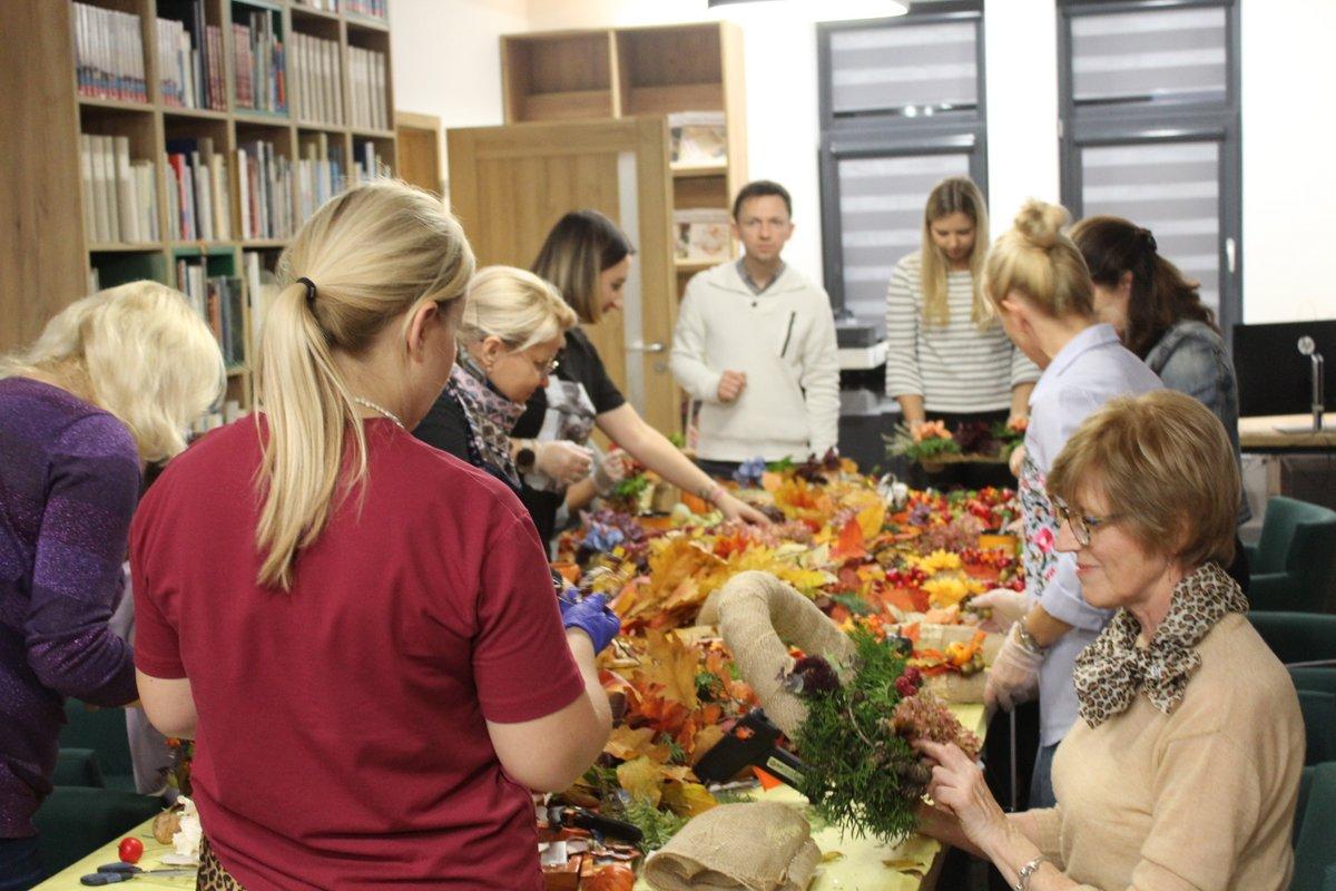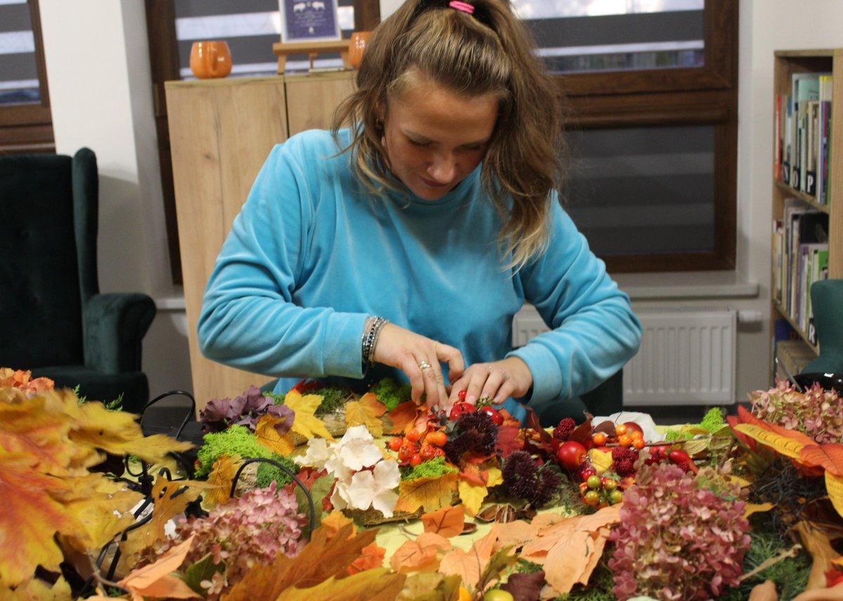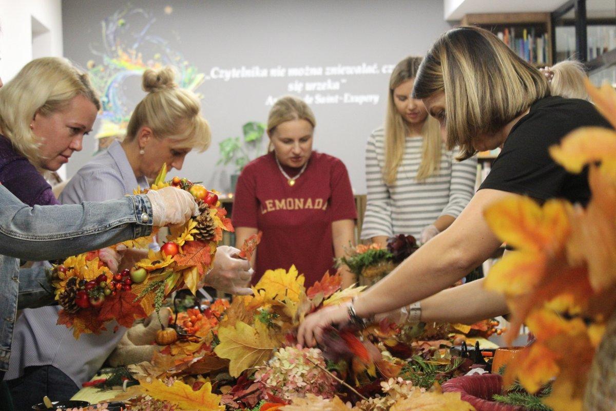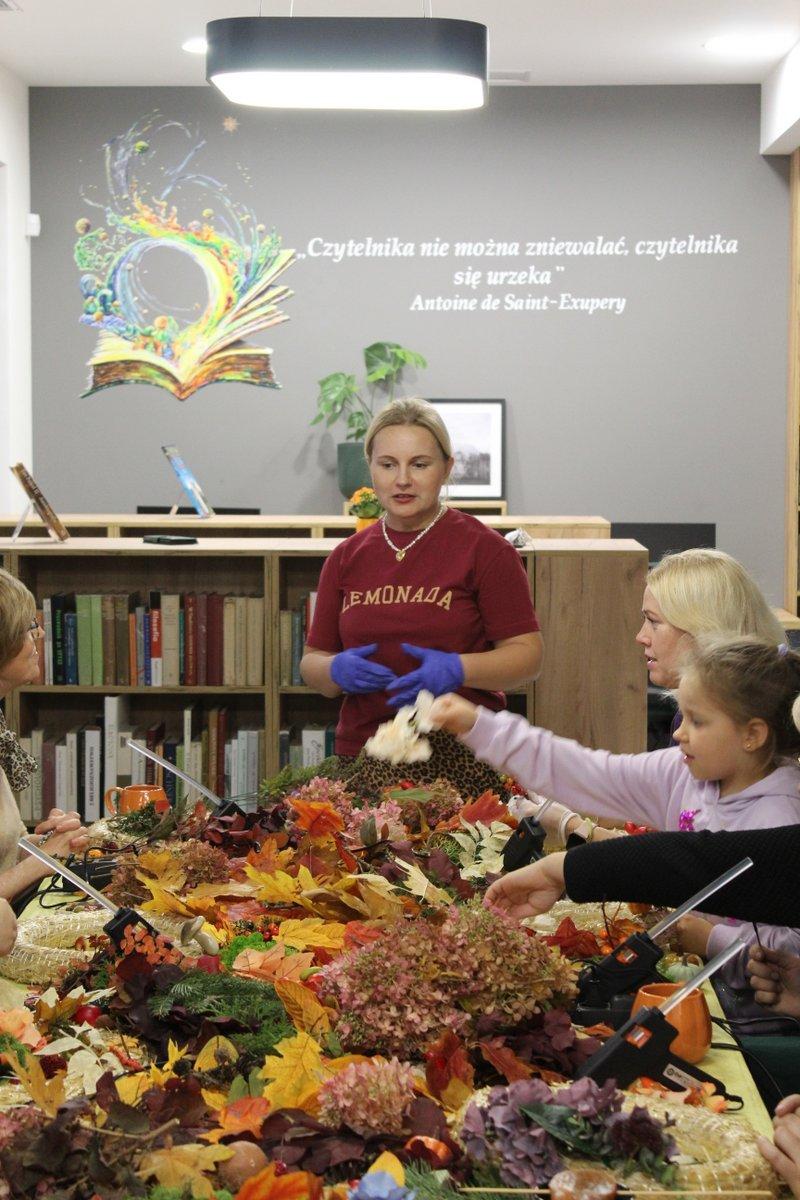 Spotkanie rozpoczęło się od pogadanki przy jesiennej herbacie i omówienia podstaw kompozycji strukturalnej wianków. Uczestniczki, korzystając z rozmaitych ozdób rozłożonych na stole w czytelni, próbowały swoich sił w tajnikach nowej dziedziny.