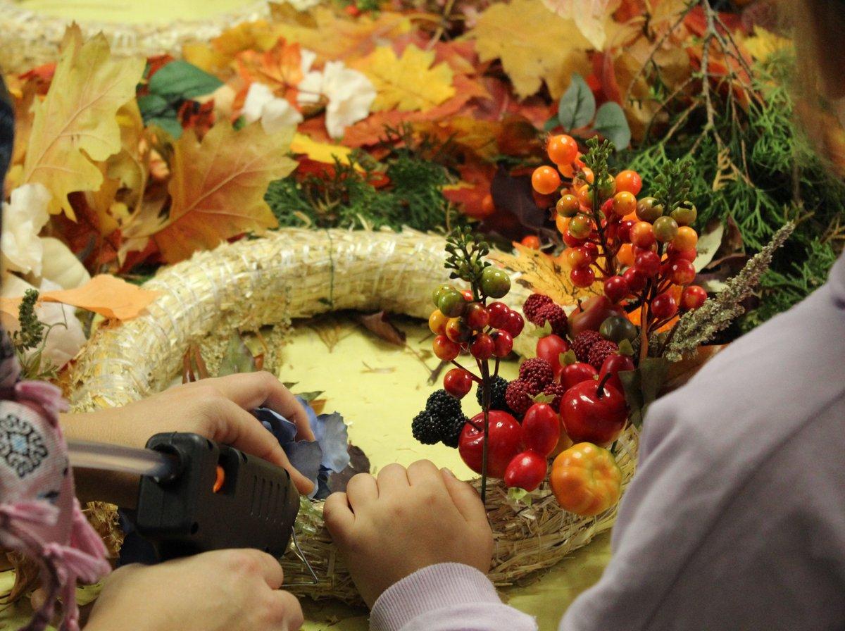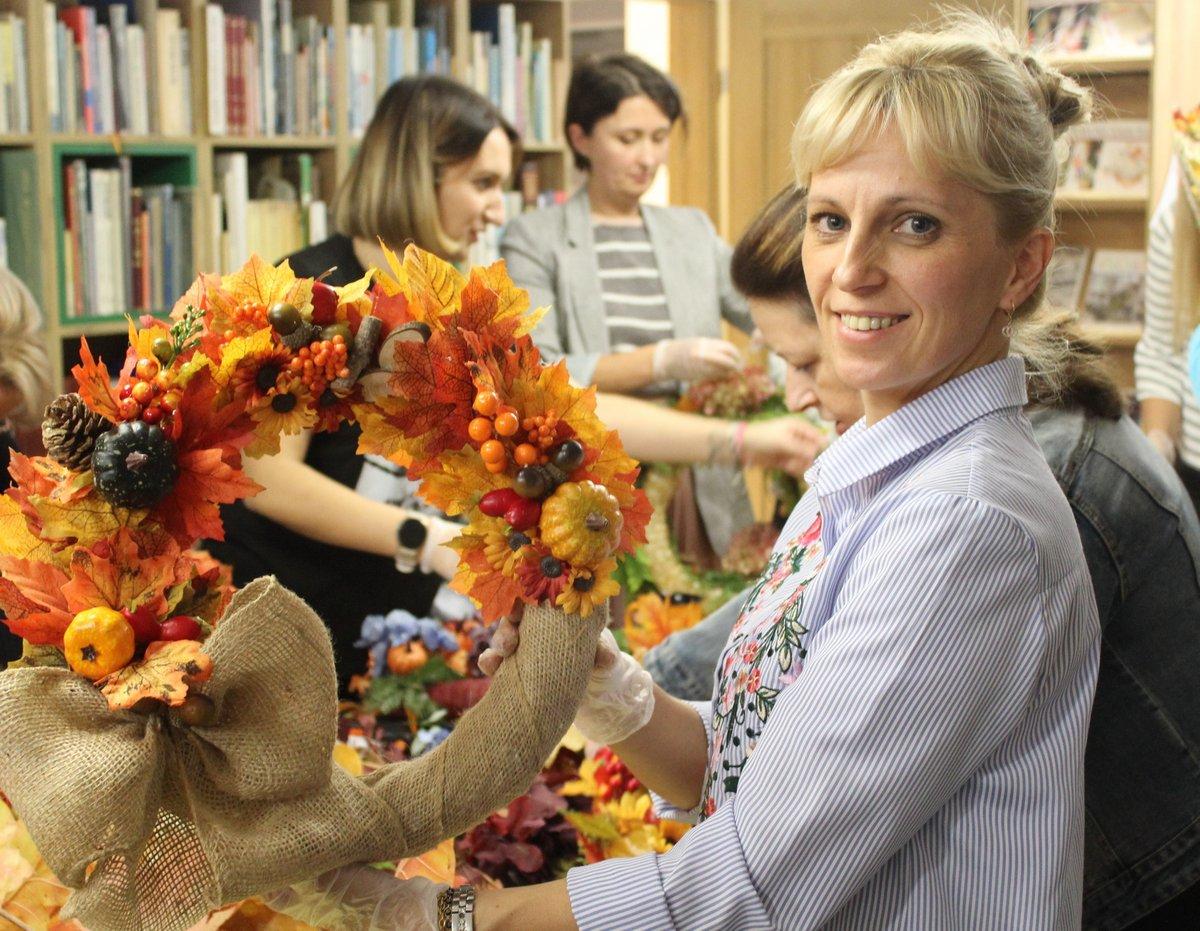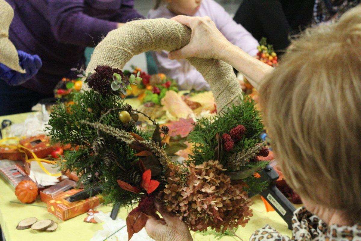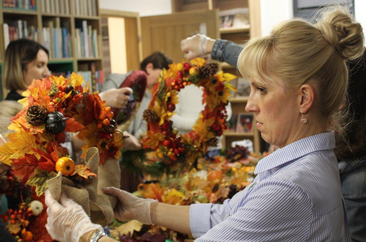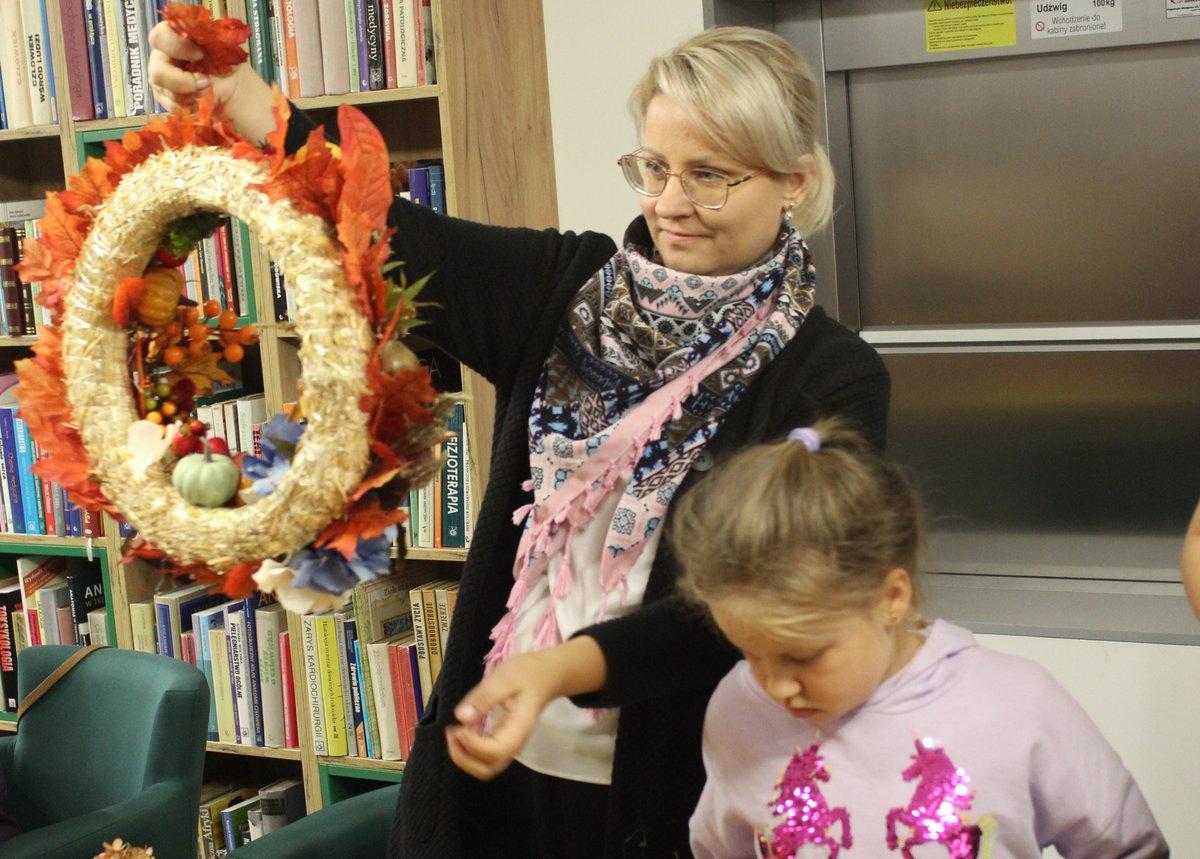 Spotkanie rozpoczęło się od pogadanki przy jesiennej herbacie i omówienia podstaw kompozycji strukturalnej wianków. Uczestniczki, korzystając z rozmaitych ozdób rozłożonych na stole w czytelni, próbowały swoich sił w tajnikach nowej dziedziny.
