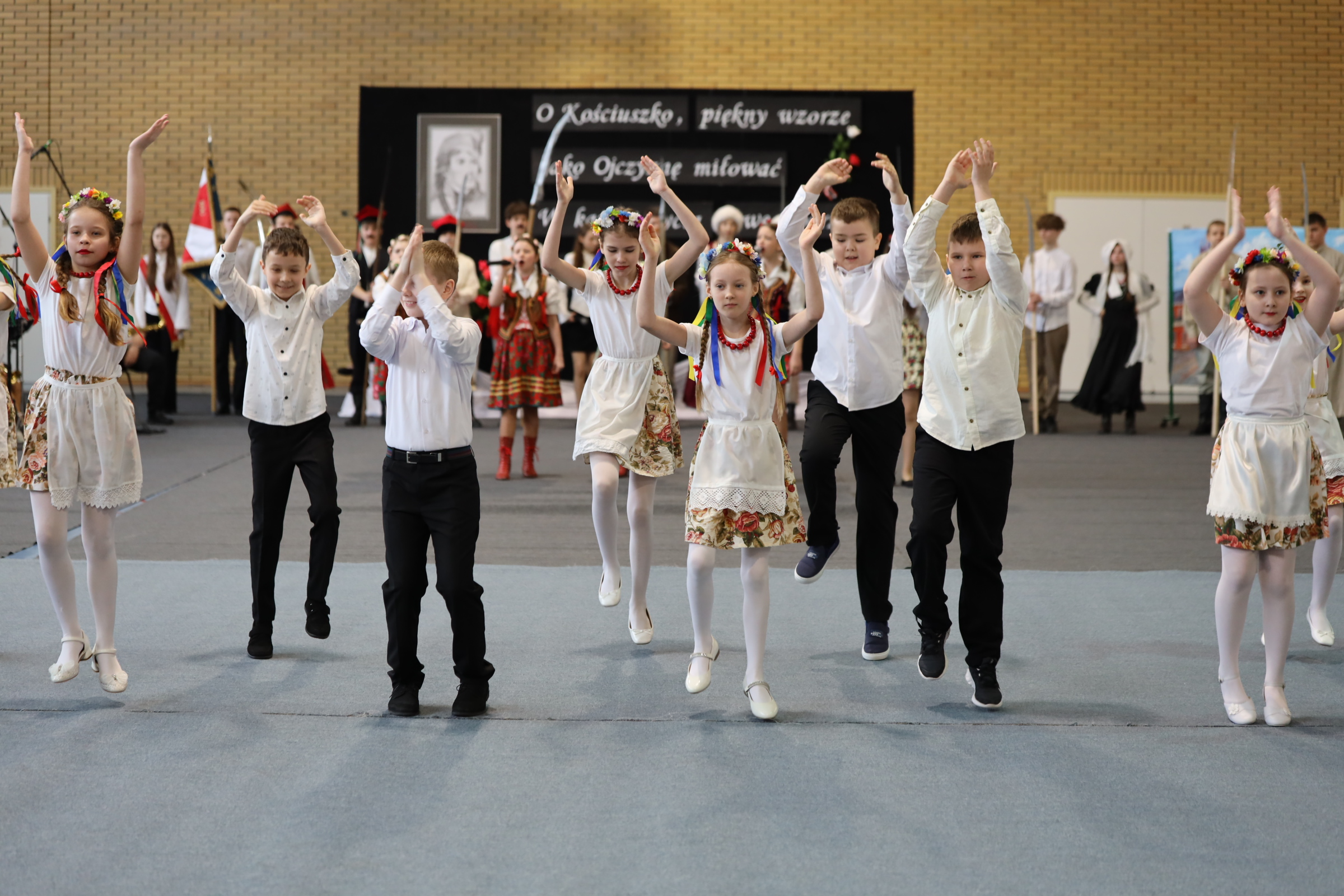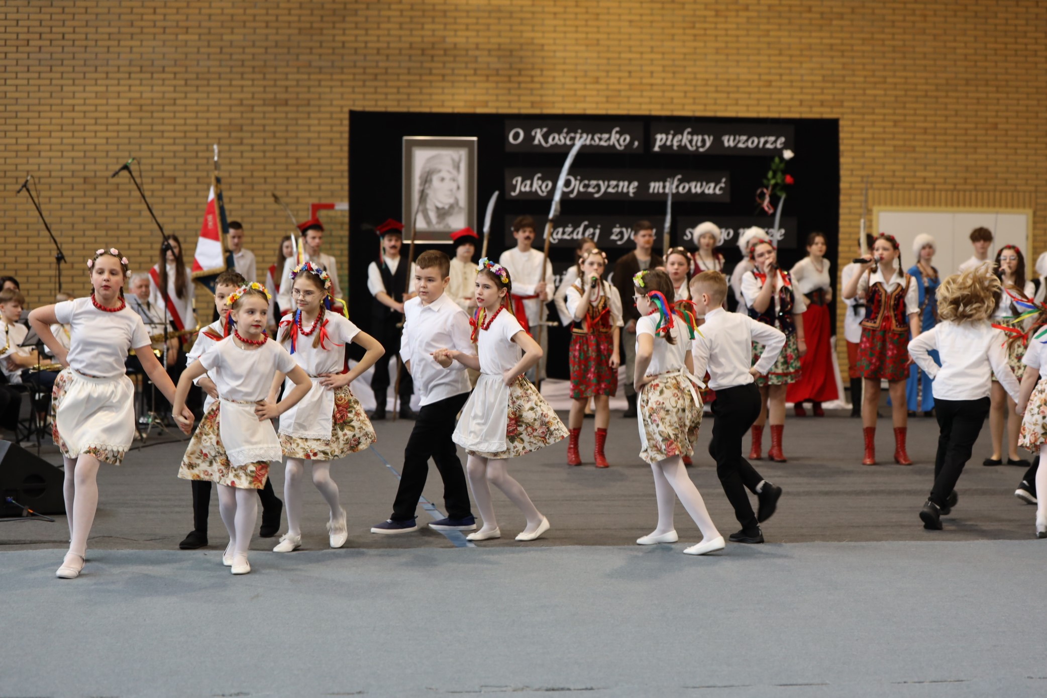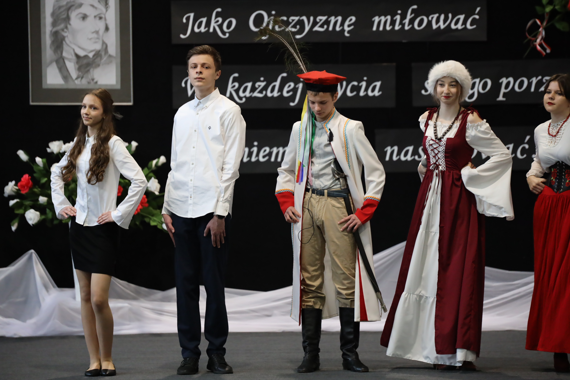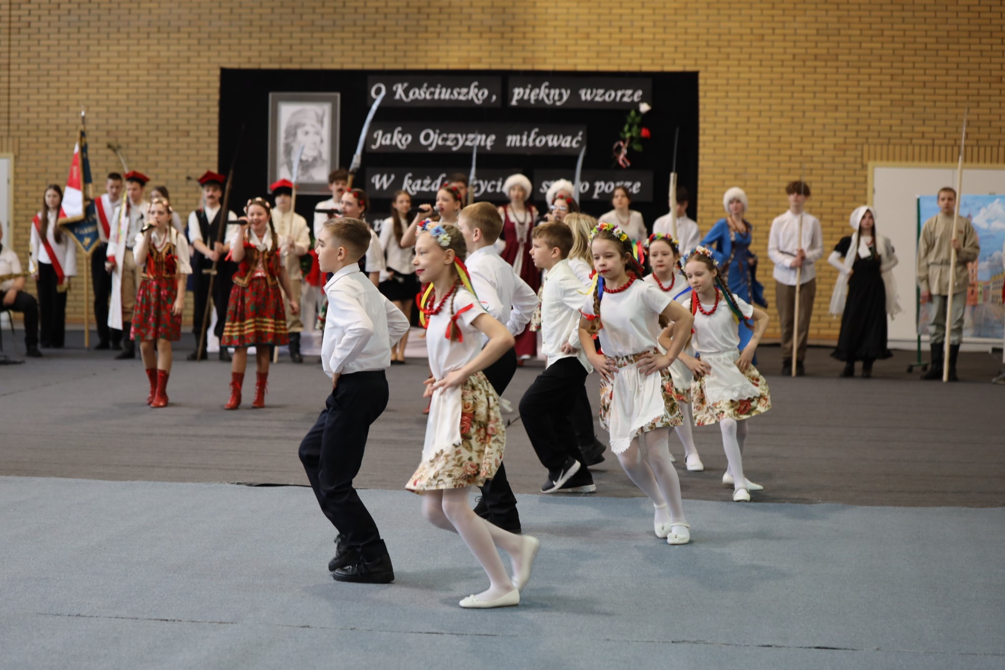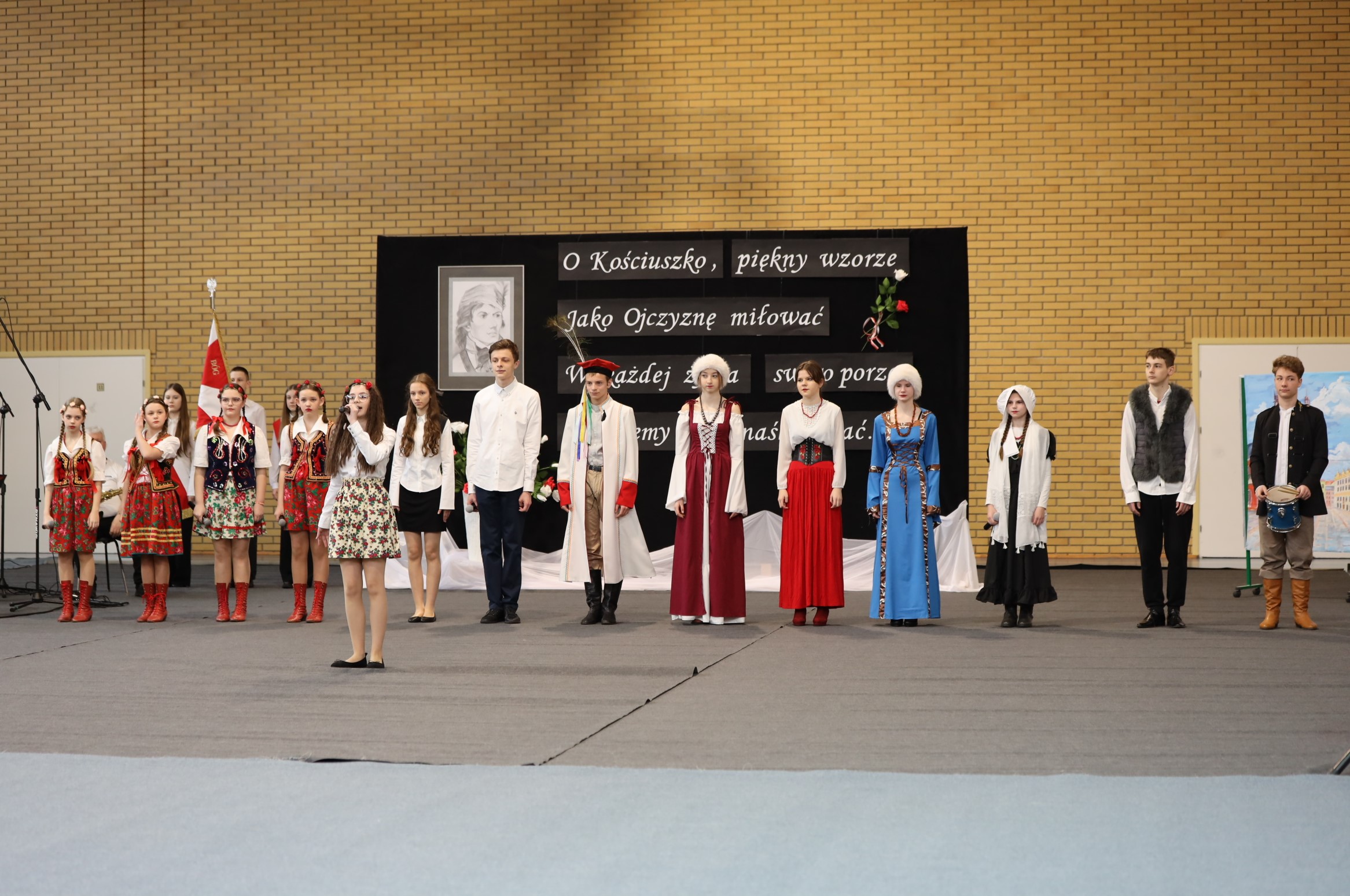 Zebrani mogli podziwiać znakomity występ uczniów z kl. VIII A, którzy pod kierunkiem wychowawczyni p. Marii Bałdowskiej-Sztukowskiej przygotowali inscenizację przedstawiającą przysięgę Kościuszki na krakowskim rynku. Można było zobaczyć oddział kosynierów, postać Naczelnika składającego przysięgę, szlachtę i krakowskich mieszczan- świadków tego wydarzenia. Występ uczniów uświetniły piosenki wykonane przez zespół wokalny p. Ewy Hakało oraz taniec przygotowany przez p. Natalię Fiedorczyk i p. Ewę Hakało. Ponadto orkiestra szkolna pod dyrygenturą p. Krzysztofa Drzemickiego zaprezentowała wiązankę pieśni patriotycznych. Wszystko to na tle scenografii, którą wykonała p. Agata Orpik.