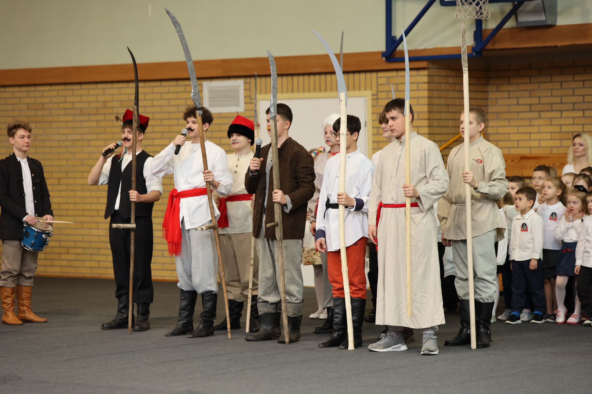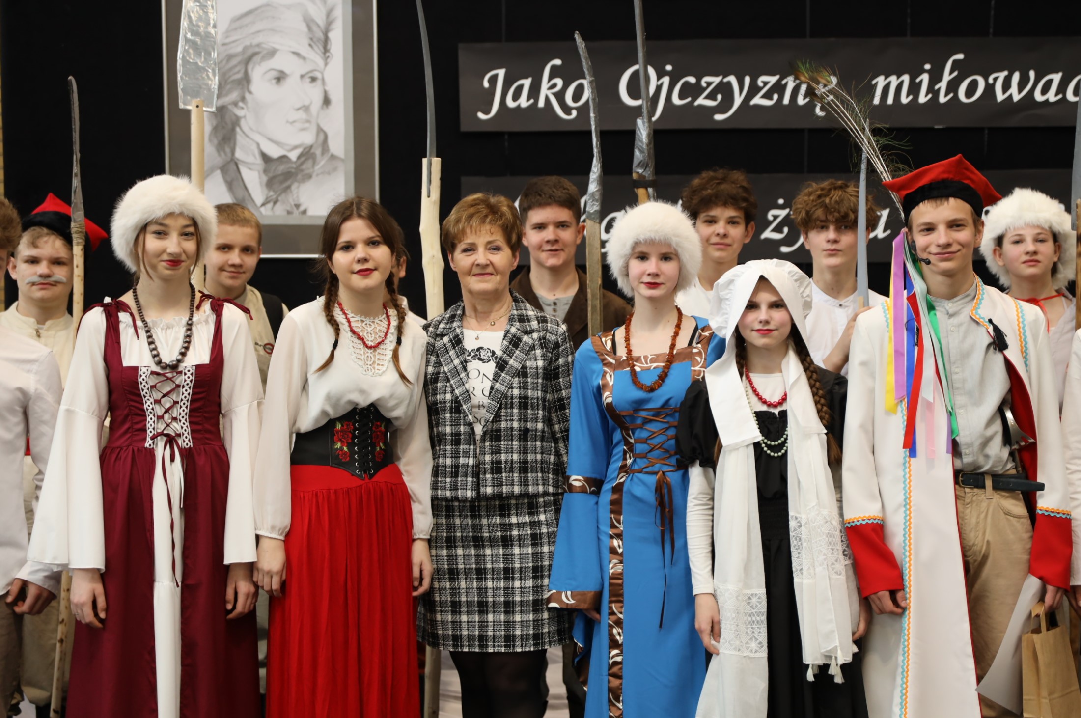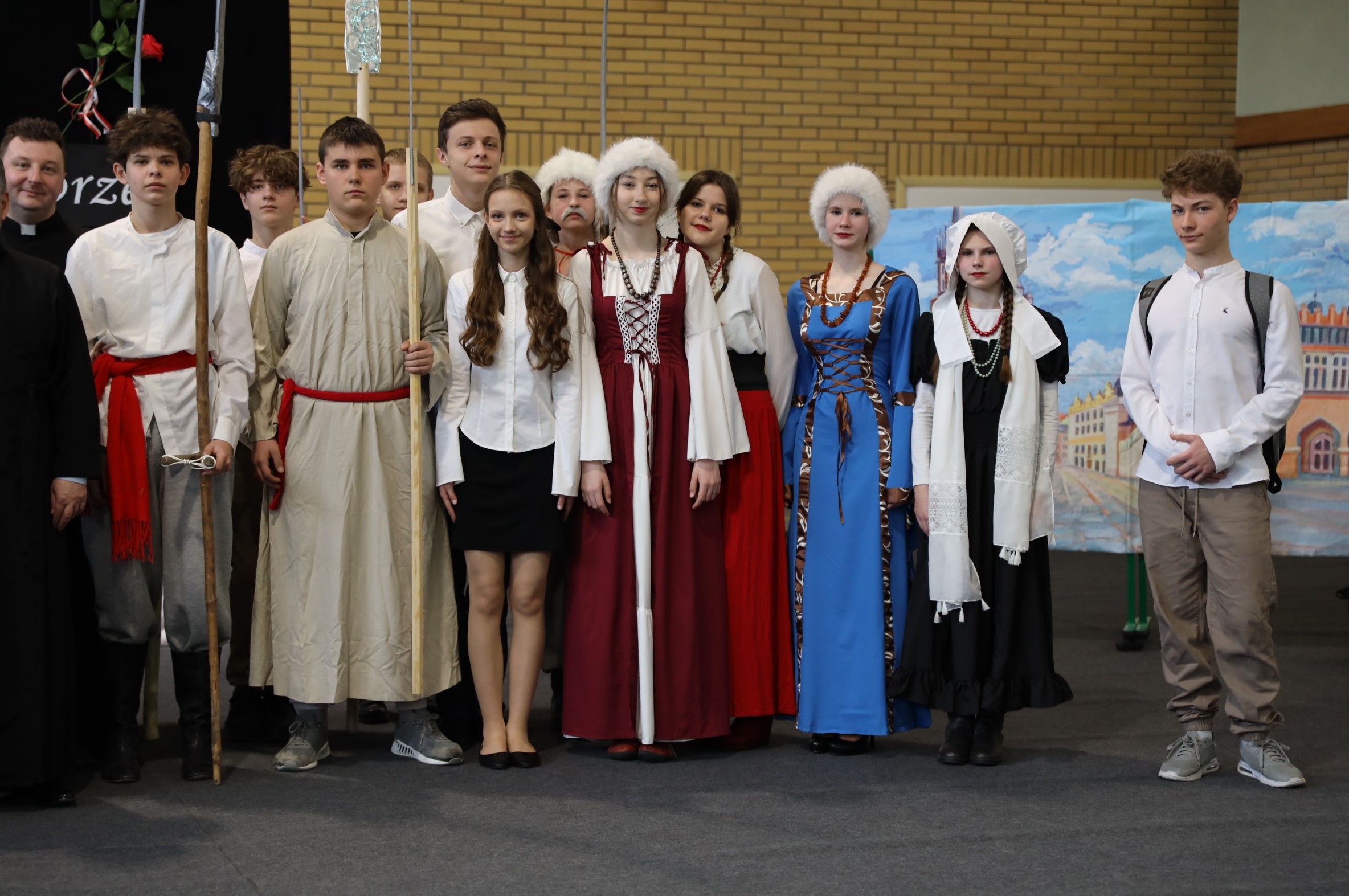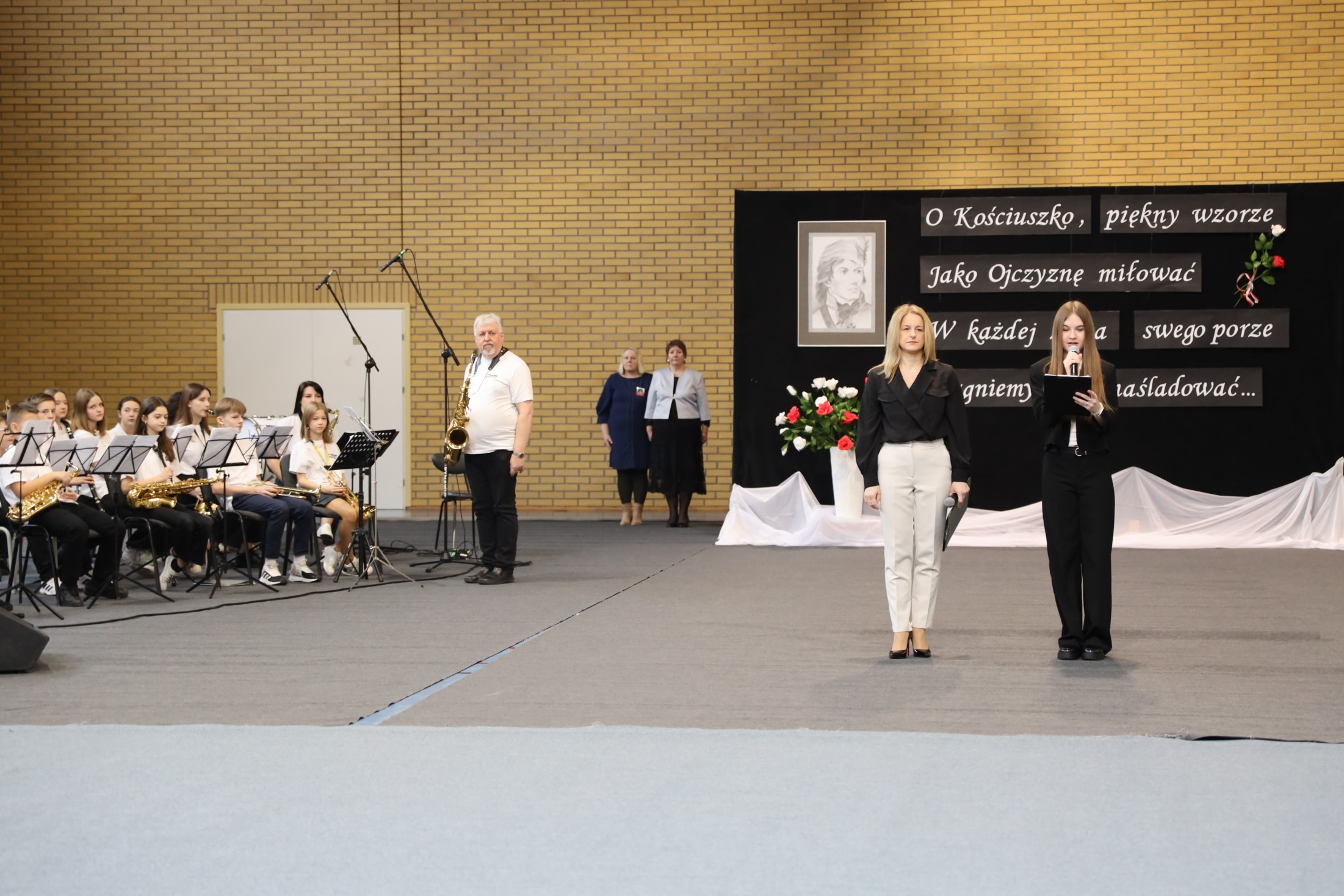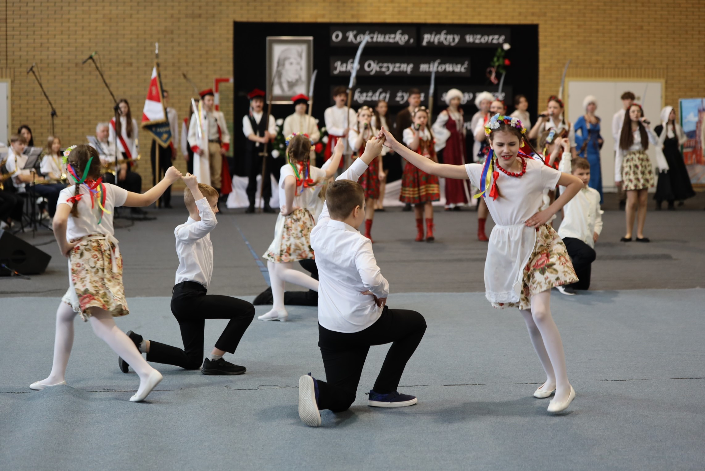 Zebrani mogli podziwiać znakomity występ uczniów z kl. VIII A, którzy pod kierunkiem wychowawczyni p. Marii Bałdowskiej-Sztukowskiej przygotowali inscenizację przedstawiającą przysięgę Kościuszki na krakowskim rynku. Można było zobaczyć oddział kosynierów, postać Naczelnika składającego przysięgę, szlachtę i krakowskich mieszczan- świadków tego wydarzenia. Występ uczniów uświetniły piosenki wykonane przez zespół wokalny p. Ewy Hakało oraz taniec przygotowany przez p. Natalię Fiedorczyk i p. Ewę Hakało. Ponadto orkiestra szkolna pod dyrygenturą p. Krzysztofa Drzemickiego zaprezentowała wiązankę pieśni patriotycznych. Wszystko to na tle scenografii, którą wykonała p. Agata Orpik.