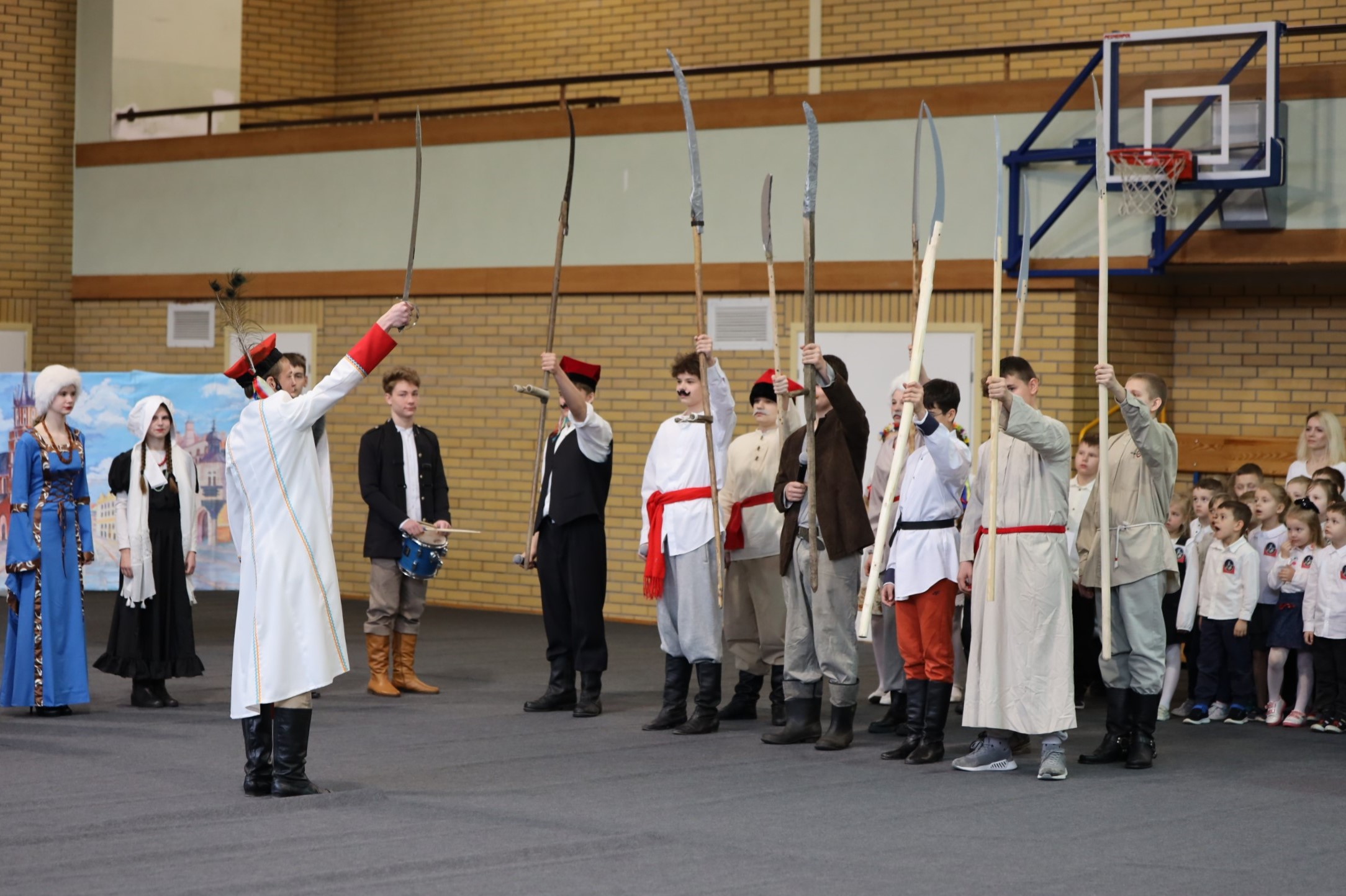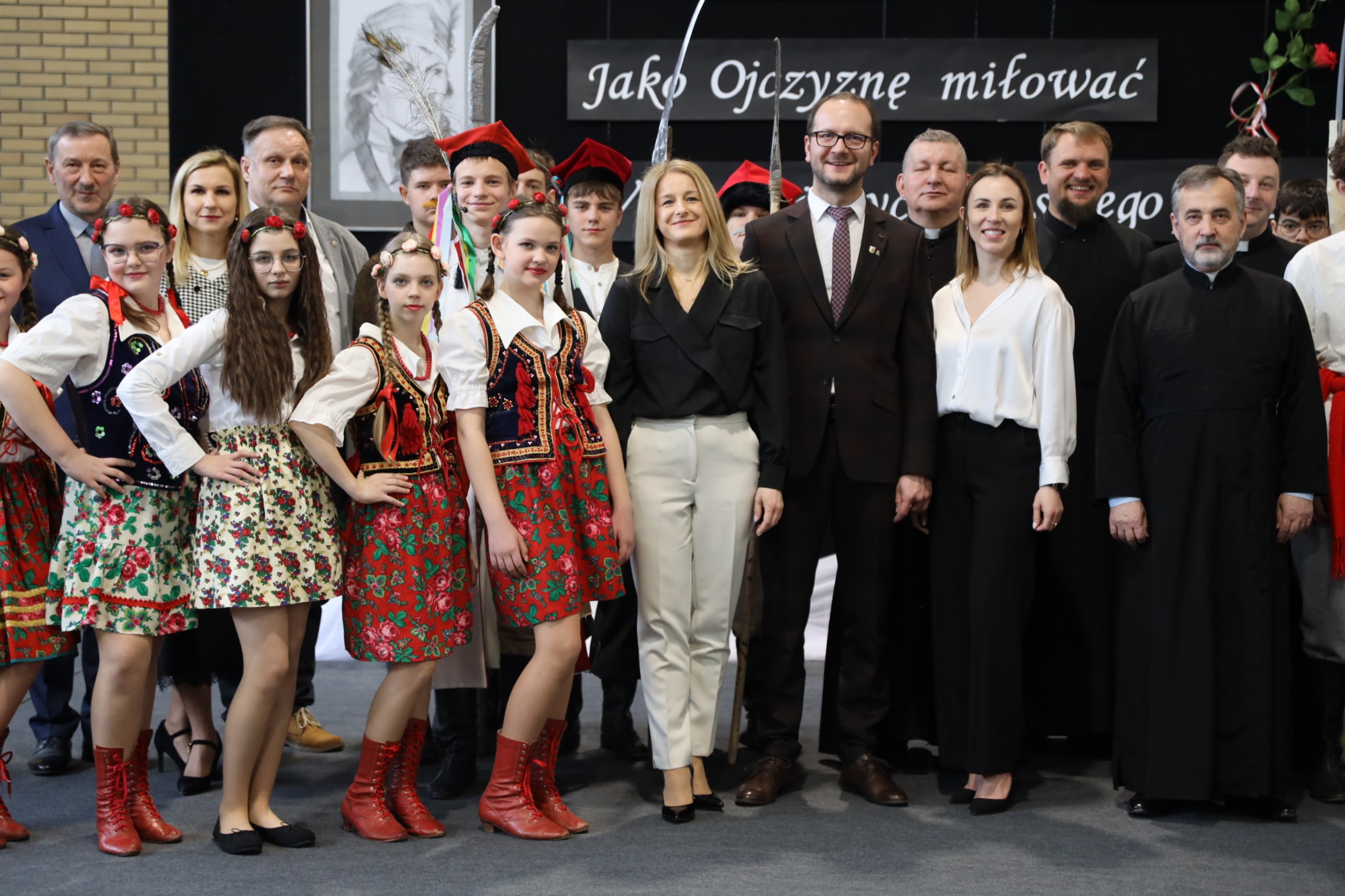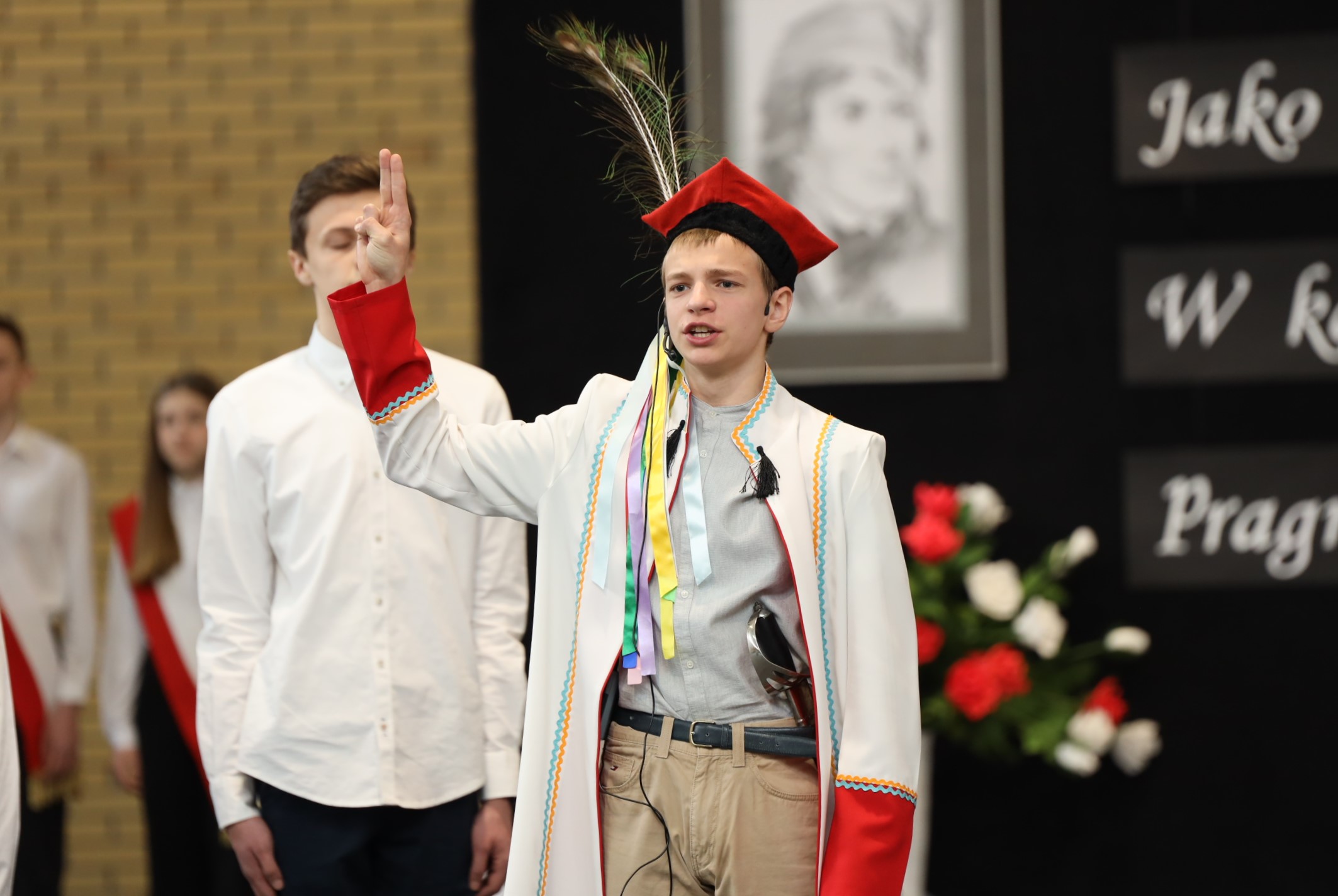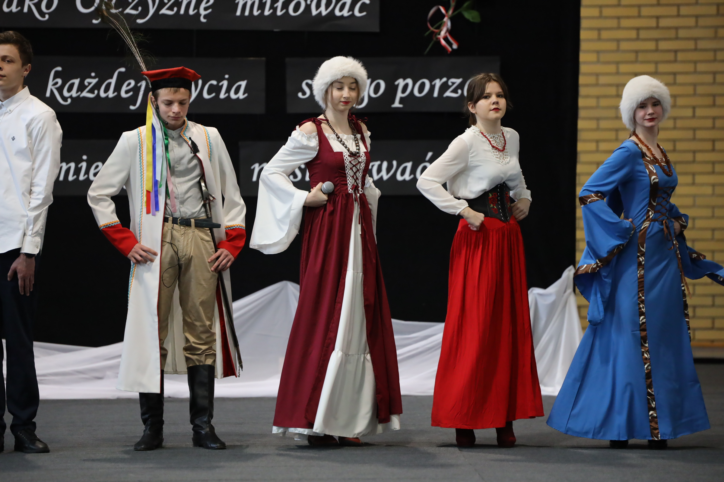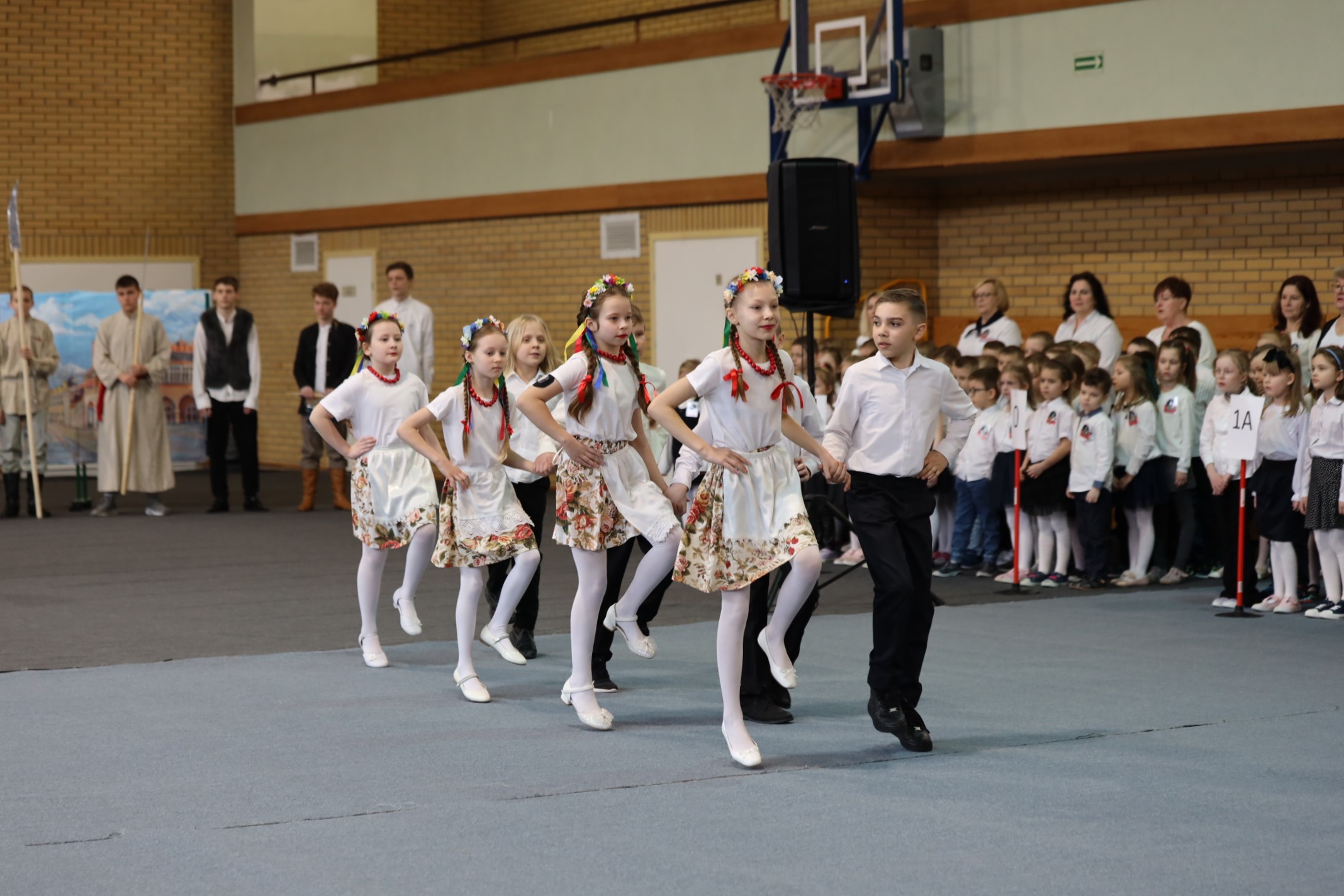 Zebrani mogli podziwiać znakomity występ uczniów z kl. VIII A, którzy pod kierunkiem wychowawczyni p. Marii Bałdowskiej-Sztukowskiej przygotowali inscenizację przedstawiającą przysięgę Kościuszki na krakowskim rynku. Można było zobaczyć oddział kosynierów, postać Naczelnika składającego przysięgę, szlachtę i krakowskich mieszczan- świadków tego wydarzenia. Występ uczniów uświetniły piosenki wykonane przez zespół wokalny p. Ewy Hakało oraz taniec przygotowany przez p. Natalię Fiedorczyk i p. Ewę Hakało. Ponadto orkiestra szkolna pod dyrygenturą p. Krzysztofa Drzemickiego zaprezentowała wiązankę pieśni patriotycznych. Wszystko to na tle scenografii, którą wykonała p. Agata Orpik.