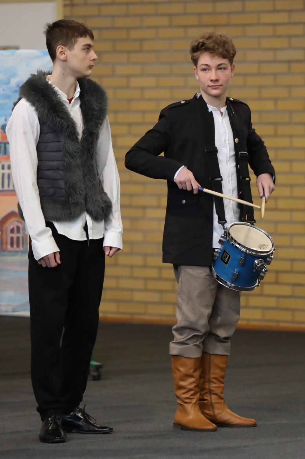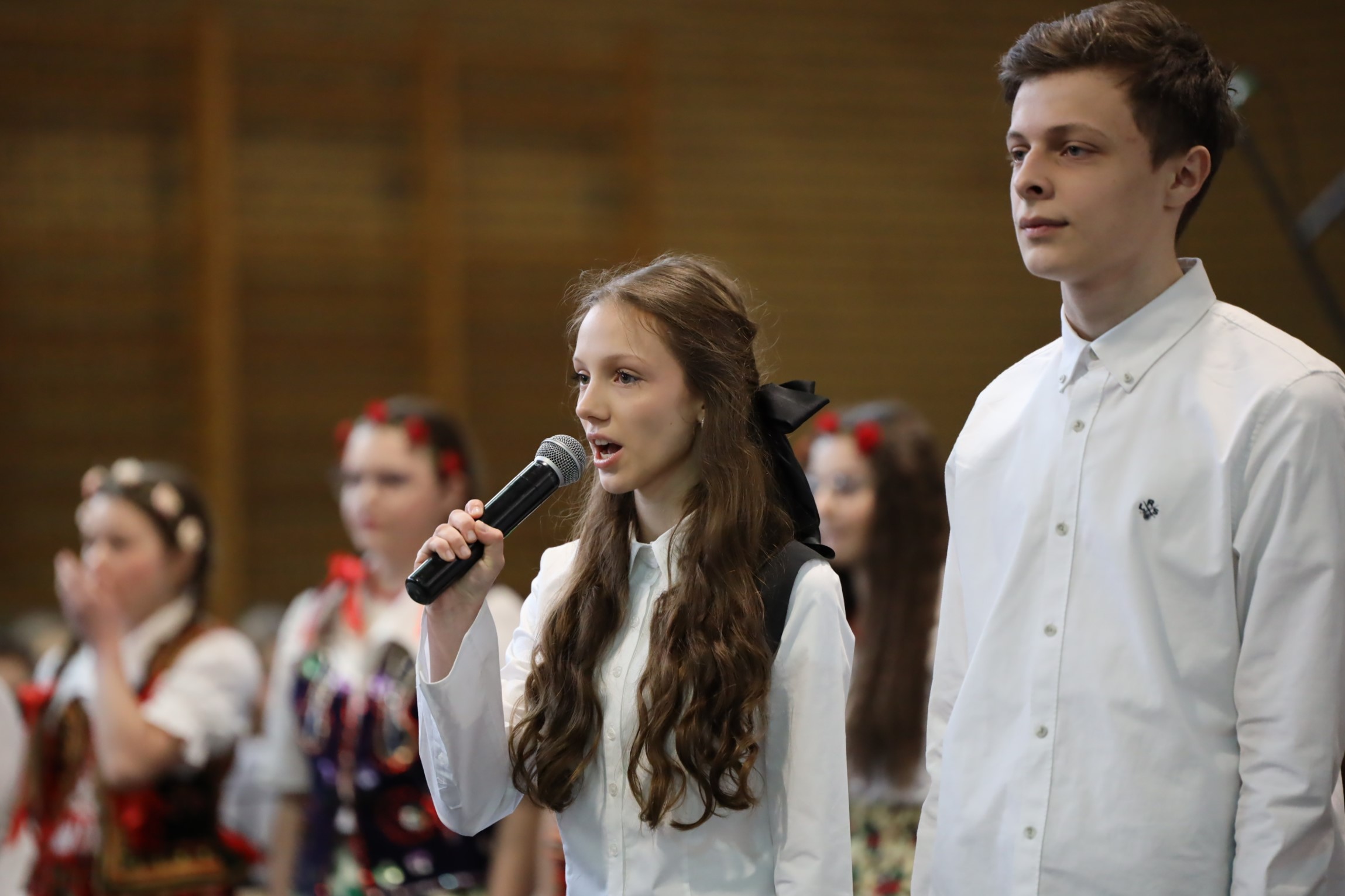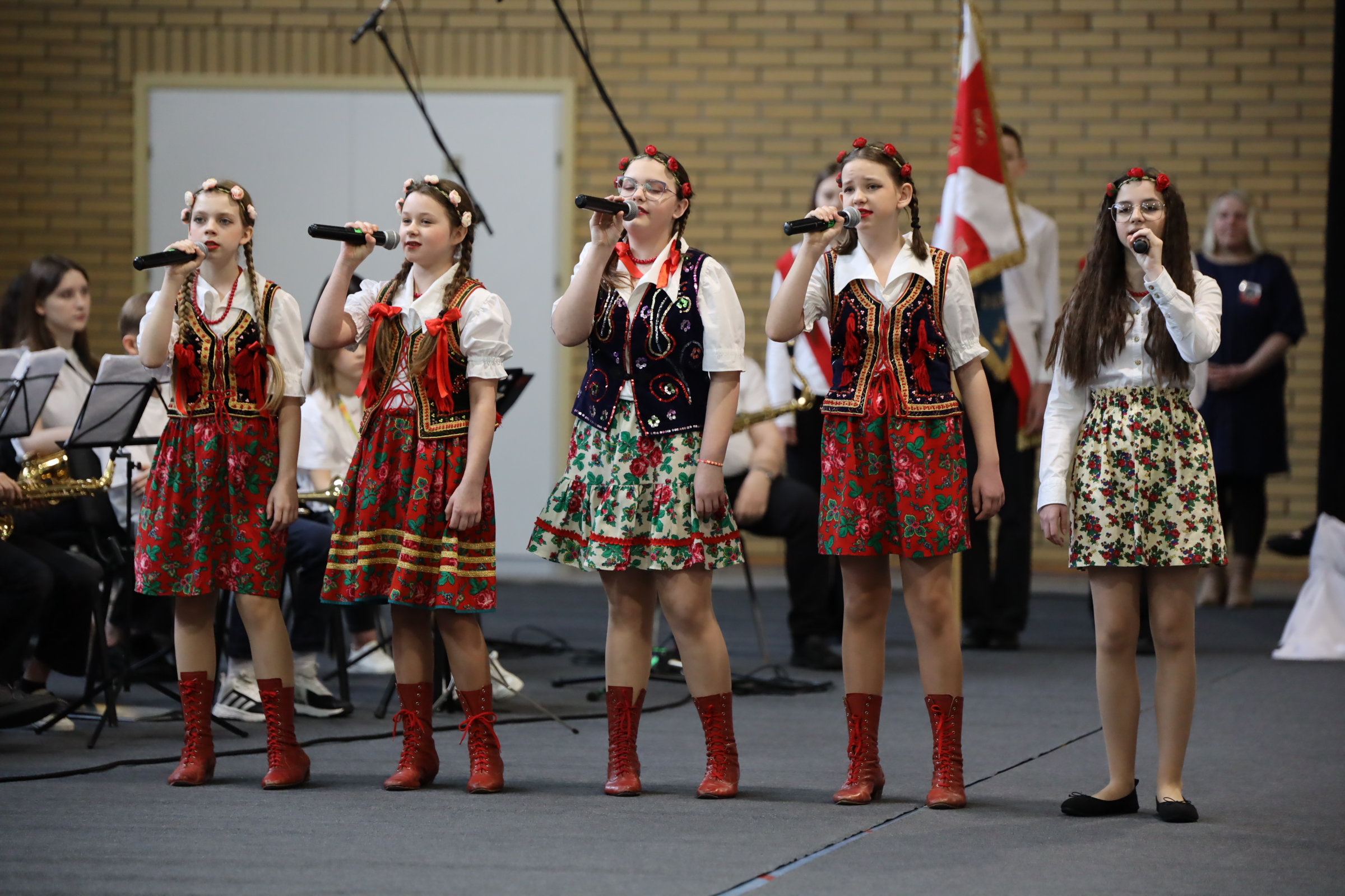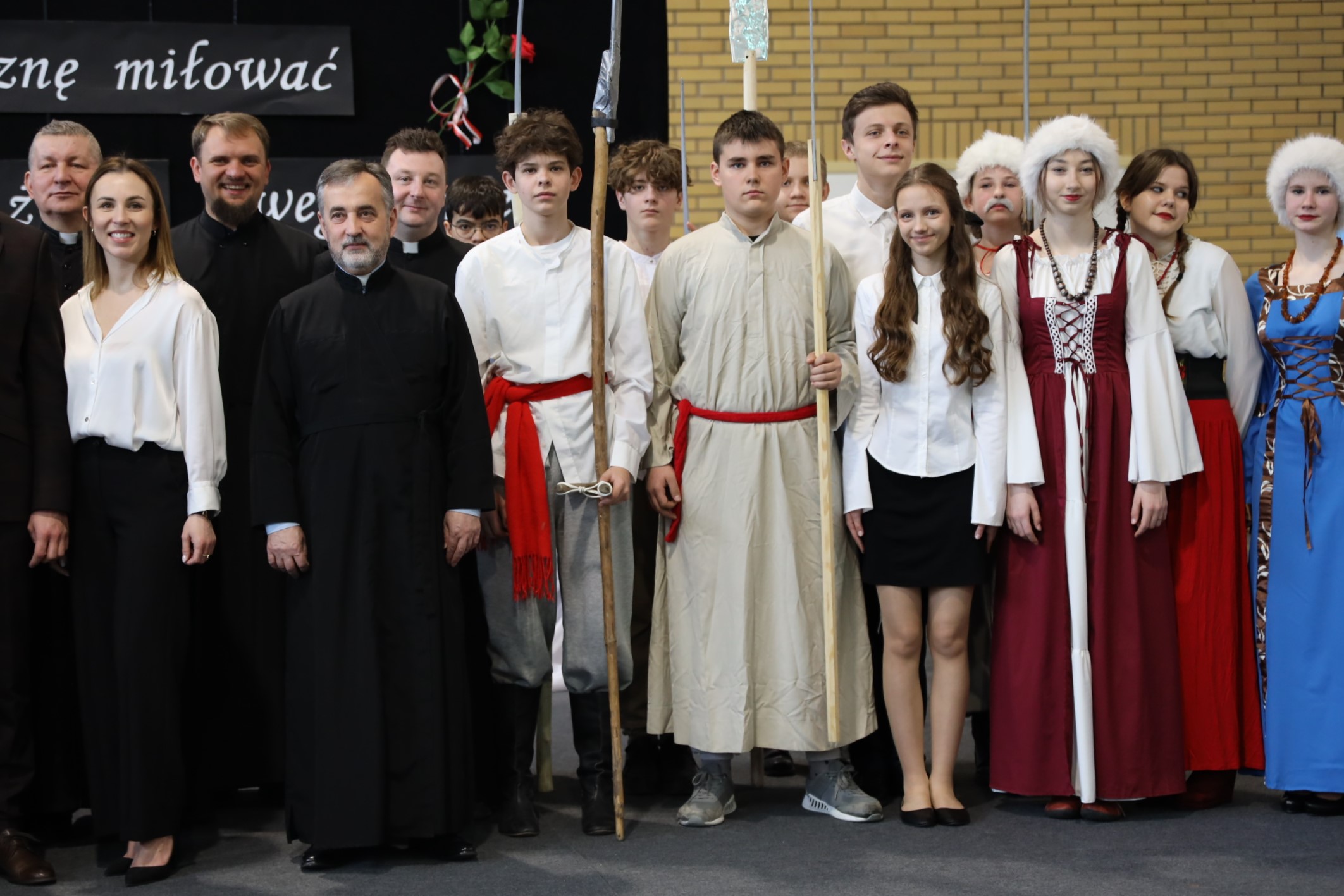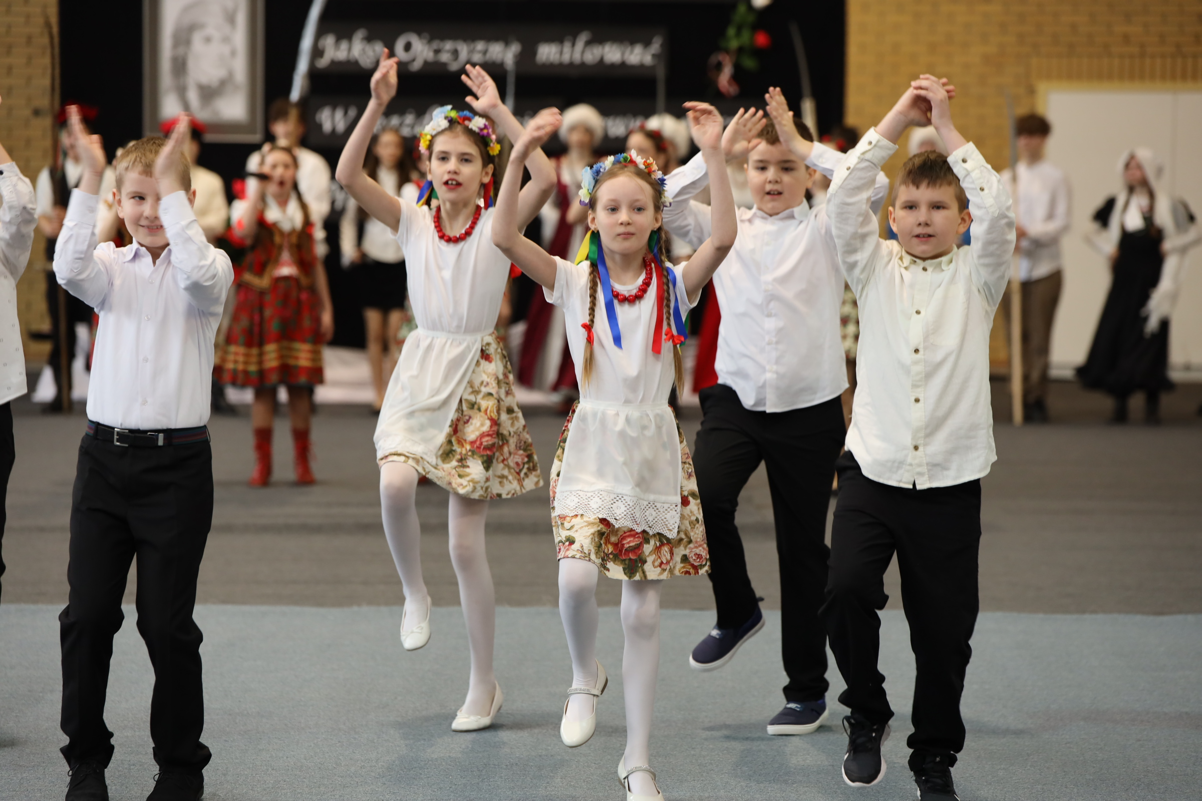 Zebrani mogli podziwiać znakomity występ uczniów z kl. VIII A, którzy pod kierunkiem wychowawczyni p. Marii Bałdowskiej-Sztukowskiej przygotowali inscenizację przedstawiającą przysięgę Kościuszki na krakowskim rynku. Można było zobaczyć oddział kosynierów, postać Naczelnika składającego przysięgę, szlachtę i krakowskich mieszczan- świadków tego wydarzenia. Występ uczniów uświetniły piosenki wykonane przez zespół wokalny p. Ewy Hakało oraz taniec przygotowany przez p. Natalię Fiedorczyk i p. Ewę Hakało. Ponadto orkiestra szkolna pod dyrygenturą p. Krzysztofa Drzemickiego zaprezentowała wiązankę pieśni patriotycznych. Wszystko to na tle scenografii, którą wykonała p. Agata Orpik.