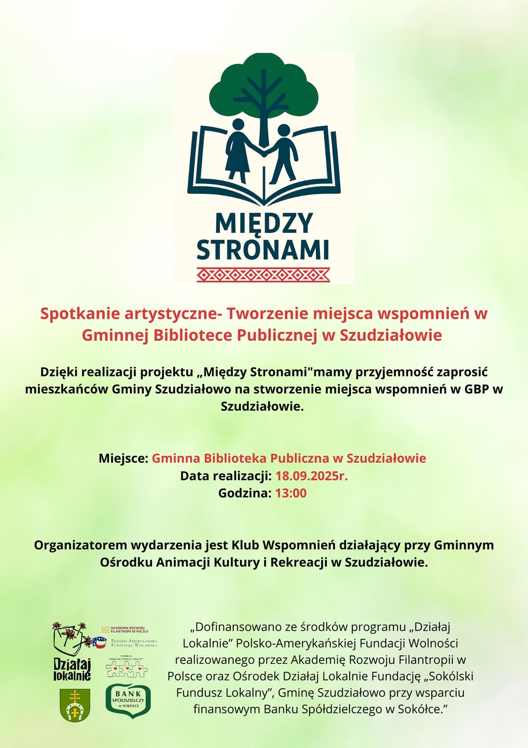 Wydarzenie odbędzie się 18 września 2025 r. o godzinie 13:00 w siedzibie biblioteki. Spotkanie organizowane jest w ramach projektu „Między Stronami", którego celem jest integracja lokalnej społeczności oraz stworzenie przestrzeni do wspólnego odkrywania, dokumentowania i przechowywania wspomnień mieszkańców.
