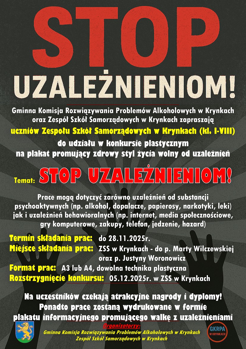 Celem konkursu jest promowanie zdrowego stylu życia wolnego od uzależnień oraz kształtowanie wśród młodych ludzi postaw prozdrowotnych i odpowiedzialnych. Prace konkursowe mogą dotyczyć zarówno uzależnień od substancji psychoaktywnych, takich jak alkohol, dopalacze, papierosy, narkotyki czy leki, jak również uzależnień behawioralnych — m.in. od internetu, mediów społecznościowych, gier komputerowych, zakupów, telefonu, jedzenia czy hazardu. Uczestnicy mają pełną swobodę w wyborze techniki plastycznej – prace powinny być wykonane w formacie A3 lub A4. Gotowe plakaty należy składać do 28 listopada 2025 r. w Zespole Szkół Samorządowych w Krynkach – do pani Marty Wilczewskiej lub pani Justyny Woroniwicz. Rozstrzygnięcie konkursu odbędzie się 5 grudnia 2025 r. w Zespole Szkół Samorządowych w Krynkach. Na uczestników czekają atrakcyjne nagrody i dyplomy, a najlepsze prace zostaną wydrukowane w formie plakatów informacyjnych promujących walkę z uzależnieniami.