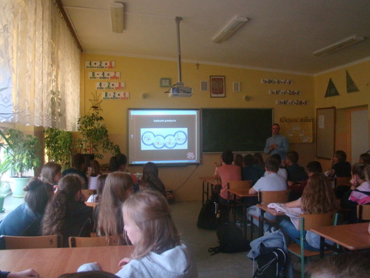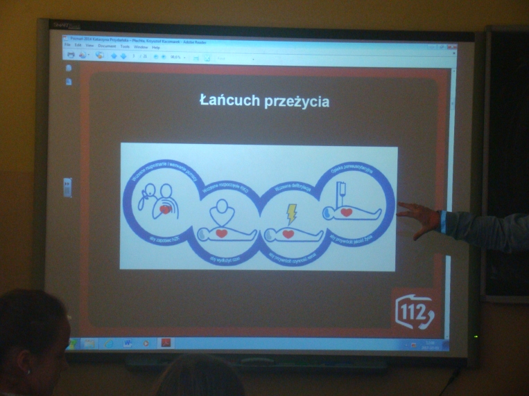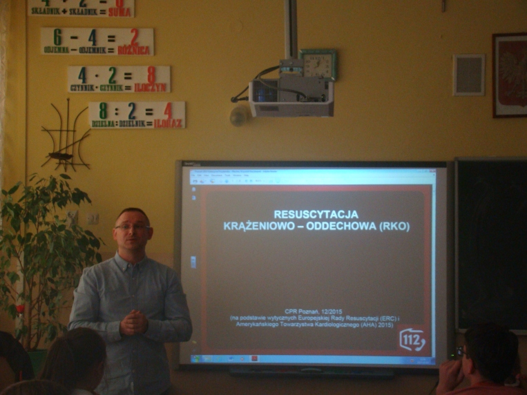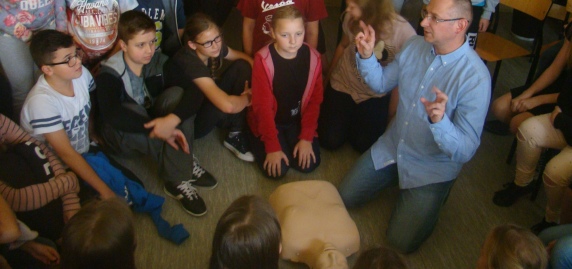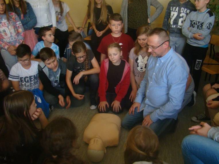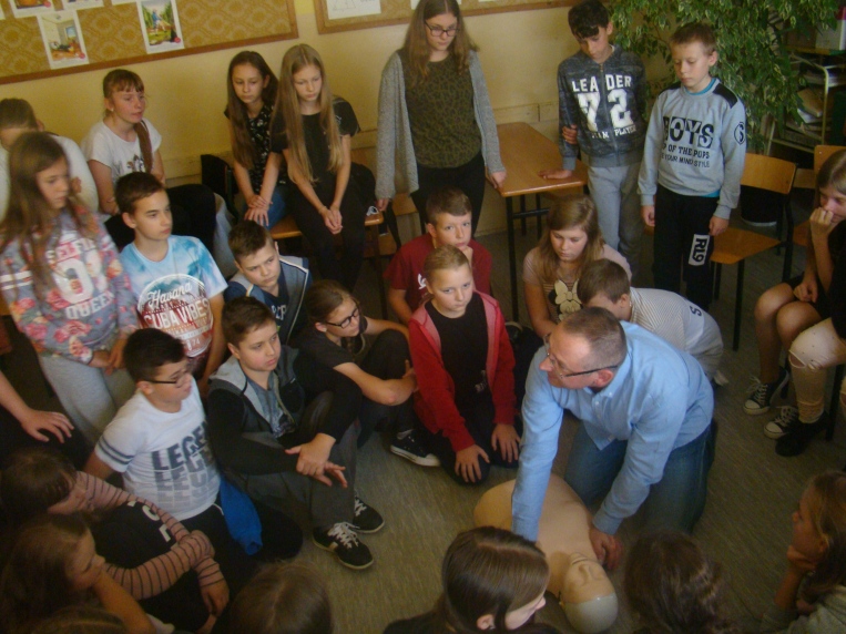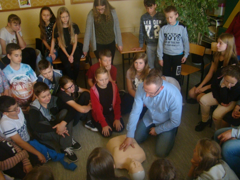 Spotkanie poprowadził ratownik medyczny pan Tomasz Łazuk. Przedstawił on uczniom racjonalne zachowanie w przypadku zagrożenia, zaprezentował jak ułożyć poszkodowanego w pozycji bezpiecznej oraz przypomniał numery alarmowe. Udzielił też wskazówek jak prawidłowo wezwać karetkę pogotowia. Podczas tych zajęć młodzi ludzie mieli także okazję przećwiczyć masaż serca na fantomie. Lekcje z udziałem ratownika polegające na zastosowaniu wiedzy w praktyce są niezbędne. Dzieci w sytuacji niebezpieczeństwa będą umiały zachować zimną krew i racjonalnie podejmować właściwe decyzje.